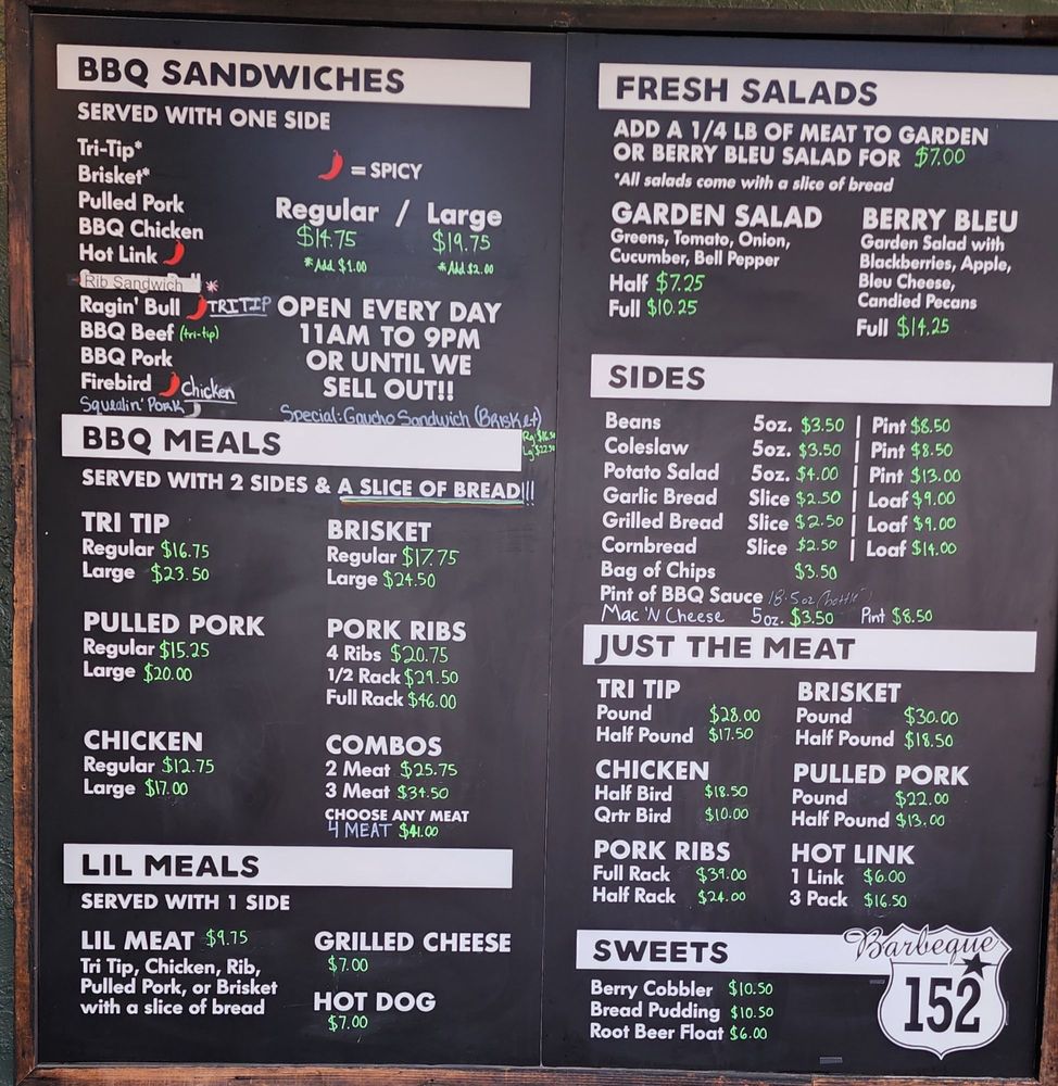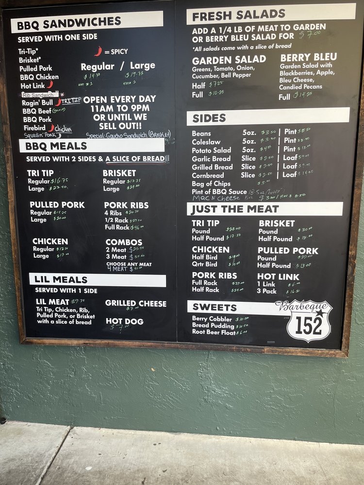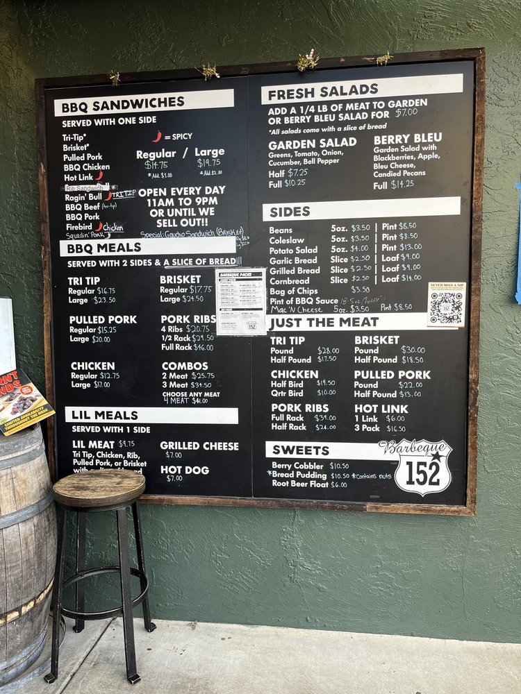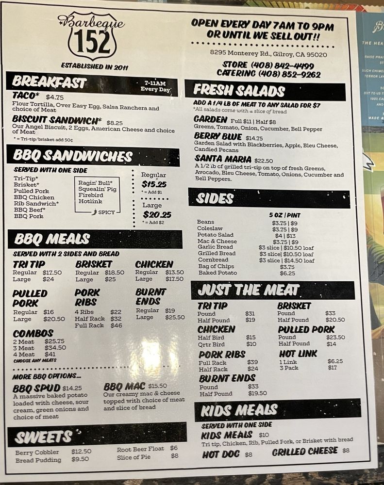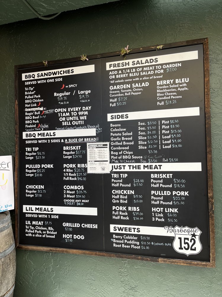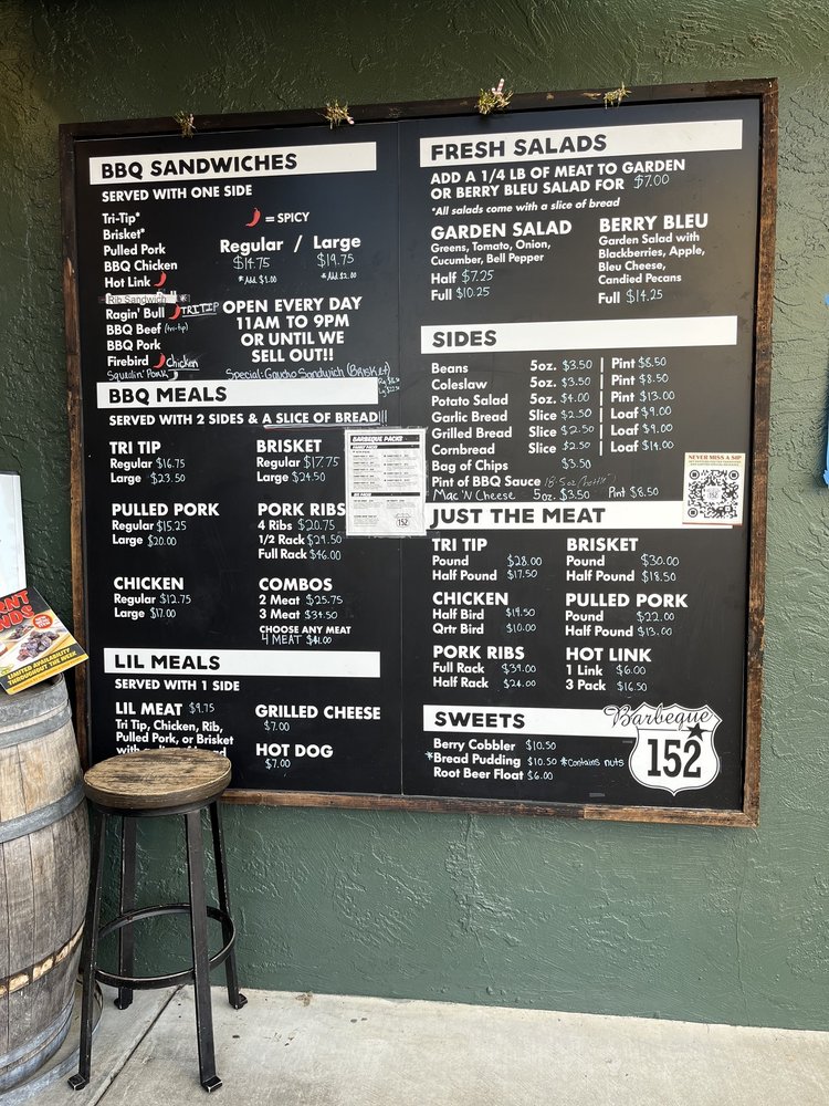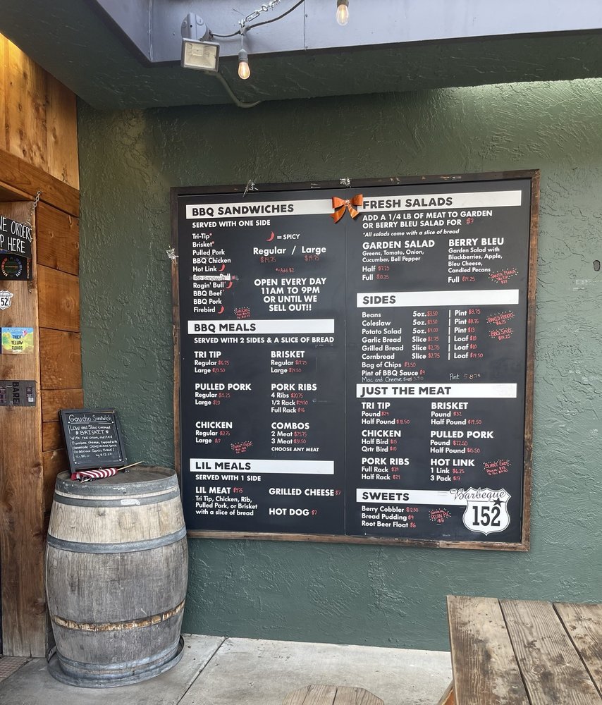 Introducing BBQ 152, a casual dining spot in Gilroy, CA, offering a variety of BBQ dishes. This restaurant is known for its tender brisket, flavorful pulled pork, and tasty sides like potato salad, baked beans, and macaroni and cheese. Customers rave about the moist cornbread and chewy garlic bread, which pair perfectly with the excellent selection of beers on tap. Despite a few complaints about flies inside, the quick service, good pricing, and delicious food keep patrons coming back. The tri-tip, ribs, and pecan pie are must-try items according to reviews. With gender-neutral restrooms, ample seating indoor and outdoor, and options for takeout and delivery, BBQ 152 is a great choice for a casual dining experience.
